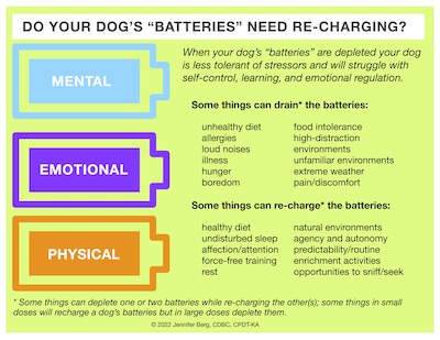 infographic with three batteries labeled Mental, Emotional, Physical. The question at the top reads Do Your Dog's Batteries Nee Re-charging?